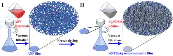 The ANF@Ag nanocomposite film was prepared by a two-step method; a schematic illustration of the preparation processes of the nanocomposite film is depicted in Figure 1. Step I: 5, 10, 20, 40 and 80 mL of the ANFs dispersion (2.0 mg/mL) were poured onto a microporous filter membrane under vacuum, respectively, followed by freeze drying under −60 °C to fix the nanonetwork structure of the resulting ANF films. Step II: a Ag NPs/PDMS/THF mixture (the mass ratio of Ag NPs:PDMS:THF = 3:10:987) was introduced into the ANF film by vacuum filtration under room temperature (about 25 °C) to obtain a multifunctional ANF@Ag nanocomposite film with 6.9, 13.8, 20.7, 27.6 and 34.6 vol% of Ag NPs.