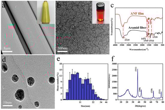 (a) SEM image and digital photograph (the inset) of the aramid fibers; (b) TEM image and digital photograph (the inset) of the ANF dispersion; (c) FTIR spectra of the aramid fiber and ANF film; (d) TEM image; (e) size distribution; and (f) XRD spectrum of the Ag NPs.