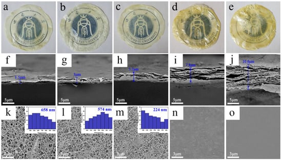 (a–e) Digital photographs, (f–j) cross section and (k–o) surface morphologies of the ANF films prepared by different amounts of the ANF dispersion: (a,f,k) 5 mL; (b,g,l) 10 mL; (c,h,m) 20 mL; (d,i,b) 40 mL and (e,j,o) 80 mL. The insets of Figure 3k–m show the pore size distribution of the ANF films prepared by 5, 10 and 20 mL of the ANF dispersion, respectively.