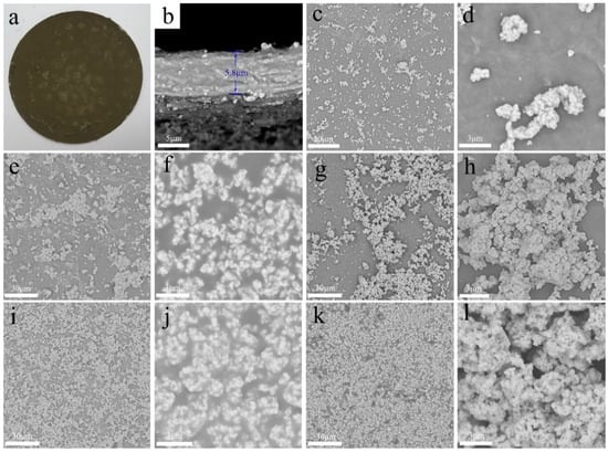Figure 4c–l displays the surface morphologies of the ANF@Ag nanocomposite films. After the introduction of the Ag NPs, the surface morphologies of the nanocomposite films changed a lot. As shown in Figure 4c–h, when the Ag content was low (≤20.7 vol%), the Ag NPs were unevenly distributed on the surface of the film. When the Ag content reached 27.6 vol% (Figure 4i,j), the Ag NPs formed a uniform layer on the surface of the film. When the Ag content further increased to 34.6 vol% (Figure 4k,l), the Ag NPs aggregated on the surface of the film, indicating that there were no more binding sites for the Ag NPs.