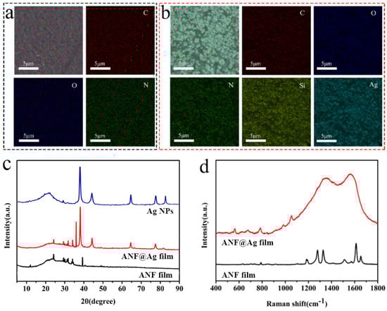 EDS mapping of the (a) ANF film and (b) ANF@Ag nanocomposite film; (c) XRD of the Ag NPs, ANF film and ANF@Ag nanocomposite film; and (d) Raman spectra of the ANF film and ANF@Ag nanocomposite film.