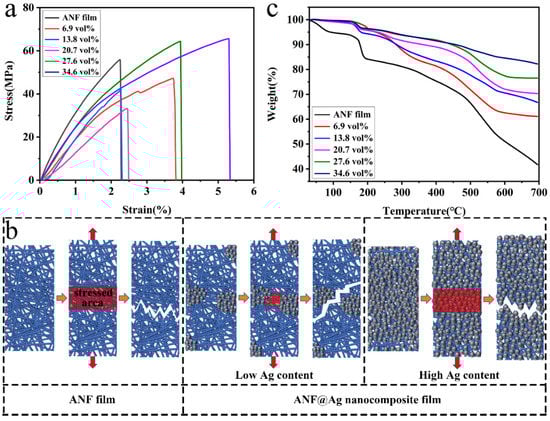 (a) Stress–strain curves of the ANF film and ANF@Ag nanocomposite films with different Ag contents; (b) schematic illustration of the fracture processes of the ANF film and ANF@Ag nanocomposite films; and (c) TG analysis of the ANF film and ANF@Ag nanocomposite films with different Ag content.