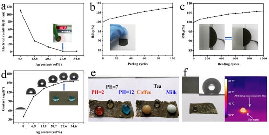 (a) Effects of Ag content on the electrical conductivity of the ANF@Ag nanocomposite film; (b) effects of adhesion-peeling cycles (the inset shows that an adhesive tape is used to adhere and peel off from the nanocomposite film) and (c) bending–unbending cycles (the inset shows that the nanocomposite film wraps around a glass rod) on the changes of the sheet resistance of the ANF@Ag nanocomposite film; (d) effects of Ag content on the contact angle of the ANF@Ag nanocomposite film (the inset shows water droplets on the surface of the film); (e) digital photographs of solutions with pHs of 2, 7 and 12 and three common drinks including coffee, tea and milk on the surface of the ANF@Ag nanocomposite film; and (f) digital photograph and IR image of a hot water droplet on the surface of the ANF@Ag nanocomposite film.