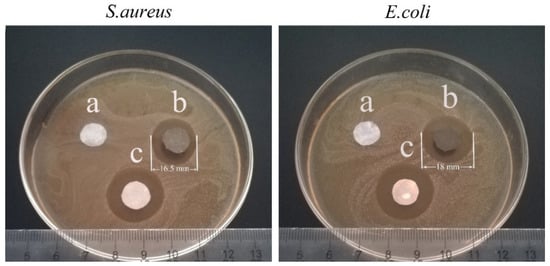 Digital photographs of the inhibition zone formed in antibacterial test of the (a) ANF film, (b) ANF@Ag nanocomposite film and (c) antibiotic blank sample (treated by tetracycline) against E. coli and S. aureus.