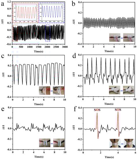 Good sensing durability and stability are critical for a pressure sensors and have been investigated by detecting the current changes under loading–unloading external forces (Figure 9a). After being tested for 3000 s, the sensing signal was constant, which directly proved that the sensor was durable and stable. To demonstrate the feasibility of the sensor in monitoring human body movement and physiological signals, the sensor was attached to different human body parts. Clearly, the curve showed a stable variation of current caused by the pressing of a finger (Figure 9b). To further explore whether the sensor can monitor multiple parts of the human body, the sensor was employed to monitor the bending of the knee (Figure 9c) and wrist (Figure 9d). The curve demonstrated great repeatability, and small peaks caused by shakes revealed that the sensor was able to detect tiny movements with a high sensitivity []. Furthermore, the sensor was attached to the abdomen (Figure 9e) and throat (Figure 9f) of the volunteer to monitor physiological signals. Obviously, the curve of breathing showed a regular respiratory rhythm of about 2.5 s per round. The curve of speaking presented great fluctuations when the volunteer pronounced with a stress on “O”. Both results revealed the great performance of the sensor in catching physiological signals.