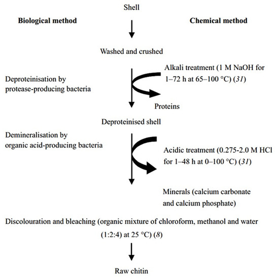 - Arbia, W.; Arbia, L.; Adour, L.; Amrane, A. Chitin Extraction from Crustacean Shells Using Biological Methods—A Review. Food Technol. Biotechnol. 2012, 51, 12–25. [Google Scholar]