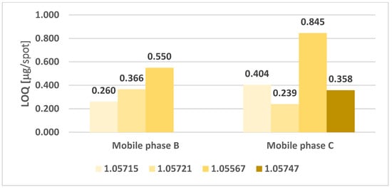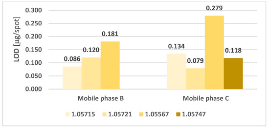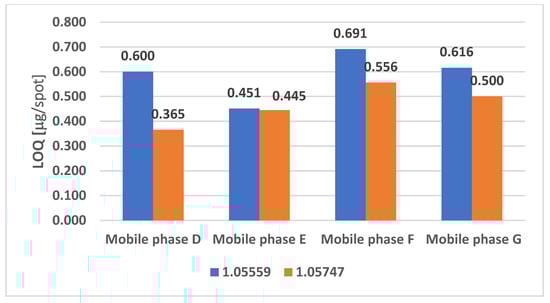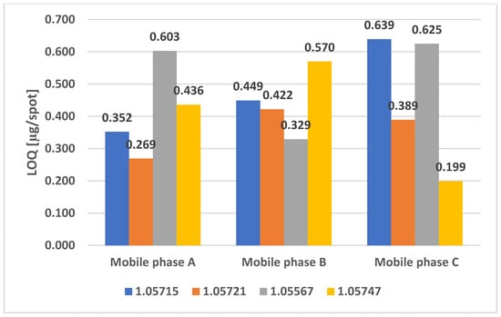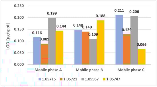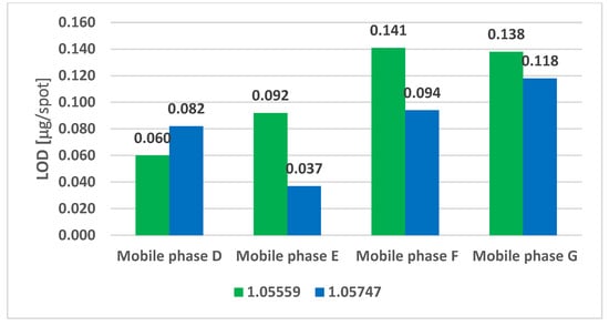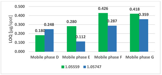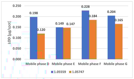 A comparison of the LOD and LOQ of sertraline tested by RP-TLC (Figure 8 and Figure 9) using four mixtures as mobile phases: methanol + water 10:0 (v/v), methanol + water 9:1 (v/v), acetone + water 10:0 (v/v), and acetone + water 9:1 (v/v), and two types of chromatographic plates (1.05747, 1.05559) indicated that the limit of detection (LOD) of sertraline is in the range of 0.037–0.141 µg/spot. Lower LOD and LOQ values were obtained for the methanol + water mobile phases (10:0 and 9:1, v/v). When these two mobile phases were used, the LOD of sertraline was in the range of 0.037–0.092 µg/spot. However, in the case of using the acetone + water mobile phases (10:0 and 9:1, v/v), the LOD of sertraline was in the range of 0.094–0.141 µg/spot. The lowest LOD and LOQ values, equal to 0.037 and 0.112 µg/spot, respectively, were obtained on the 1.05747 plate using the E mobile phase composed of methanol + water (9:1, v/v). The second lowest values for LOD (0.060 µg/spot) and LOQ (0.180 µg/spot) were obtained on the 1.05559 plate in combination with mobile phase D, which had the following composition: methanol + water (10:0, v/v). The third consecutive lowest LOD (0.082 µg/spot) and LOQ (0.248 µg/spot) results were obtained on the 1.05747 plate in combination with mobile phase D, with the following composition: methanol + water (10:0, v/v). The use of the mentioned sorbents together with the given mobile phases made it possible to detect and determine the lowest concentration of sertraline.