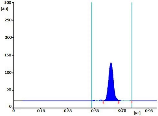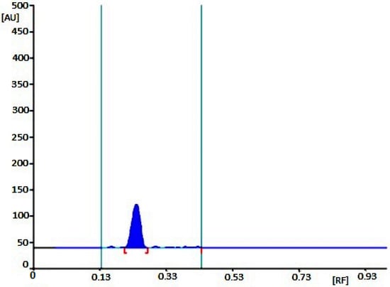 Densitometric analysis was also performed using a TLC Scanner 3 densitometer with the winCATS 1.4.2 software by Camag, where the radiation source was a deuterium lamp. The optimal wavelengths during scanning were 200 nm and 202 nm for fluoxetine and sertraline, respectively. The analysis was performed in the absorption mode, with a scan speed of 20 mm/s, a slit size of 10.0 × 6.0 mm, Micro, and a resolution of 100 µm/step. The spectra of fluoxetine and sertraline are provided in the Supplementary Materials (Figures S1 and S2).