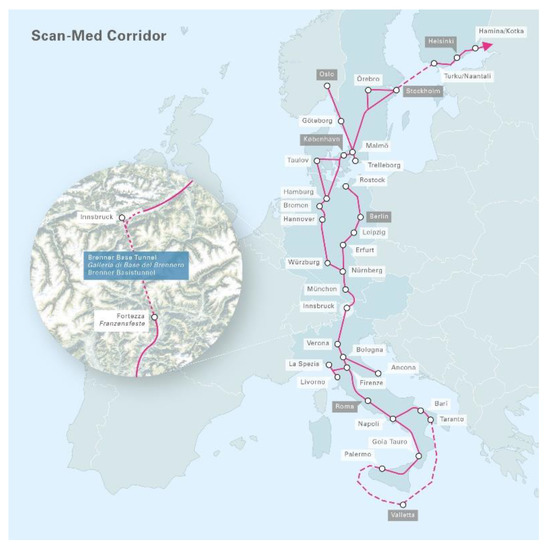 Location of the BBT, part of the Scandinavian–Mediterranean Corridor, for short Scan-Med Corridor, taken from [4].