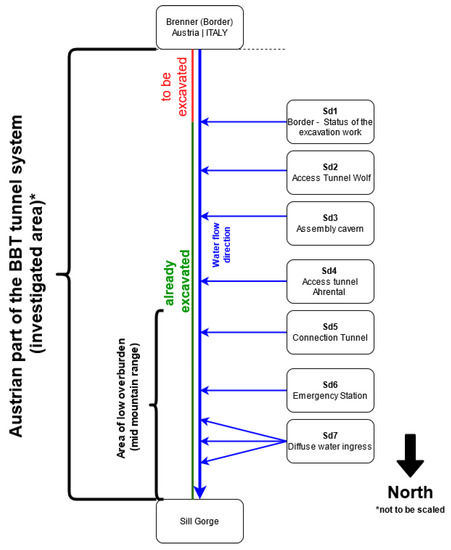 - During the construction phase, Sd1 and Sd2, south of access tunnel Wolf—are not yet fed into the overall drainage system. The water of this construction lot is pumped back to the surface and discharged into the receiving water—the Upper Sill. When the BBT will be in operation, Sd1 and Sd2 will be directed into the main drainage system, which will considerably increase the total discharge rate of water. Therefore, in order to give a forecast of water discharge and temperature for the operational phase, Sd1 and Sd2 must be considered.