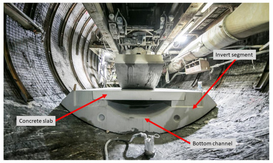 Figure 5. Invert segment with bottom channel and concrete slab (taken and modified from [6]). - Once the main tunnels are excavated, the amount of water entering the tunnels will increase in the hydrographically homogeneous areas where the main tunnels is excavated. This is related to the increase in surface area through which water can enter the tunnel. This increase in the discharge rate is estimated by a factor of 1.1–1.3, based on experiences of the first excavated main tunnel sections.