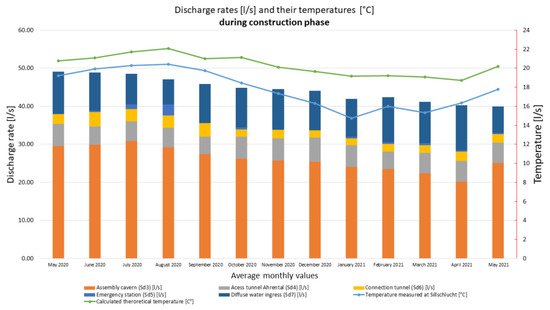 Figure 6 shows the discharge rates and temperatures at the northern tunnel portal from May 2020 until May 2022. Discharge rates at the Sill Gorge portal decreased continuously over the period of May 2020–May 2021, from 49.1 to 40.0 L/s. In the period of May 2020–April 2021, one of the largest heat supply sections, in particular, Sd3, showed a continuous decrease until the discharge rate increased again in May 2021. The theoretical temperature calculated by Richmann’s mixing rule showed the highest temperatures in August at 22.0 °C and the lowest temperatures in April at 18.7 °C. In the wintertime, from December to April, the temperature ranged between 19.7 °C and 18.7 °C. In the warmest months, the temperature varied from 22 °C to 20.1 °C.