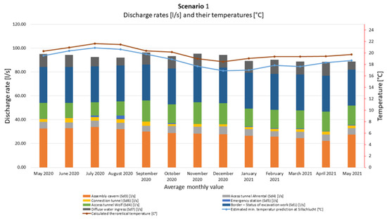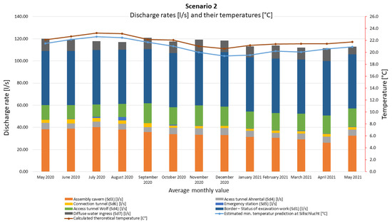 Figure 8 displays Scenario 2. The discharge rate would be highest in September 2020 at 120.9 L/s and lowest in April 2021 at 111.6 L/s. Again, slightly higher discharge rates would be present during the months of September to December. The theoretically highest temperatures would appear in July at 23.2 °C, while the minimum would occur in December at 20.6 °C. The calculated minimum temperature would be lowest in December with 19.4 °C and highest at 22.6 °C in July. The deviation of the theoretical temperature and the temperature influenced by cooling would be highest in January at 1.6 °C and lowest in September at 0.5 °C.