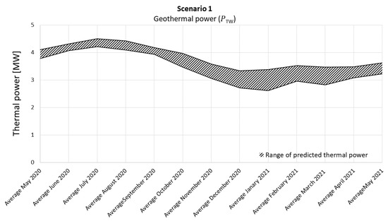 Figure 9 and Figure 10 show the geothermal power calculated be means of equation (3) for Scenarios 1 and 2 and indicating that the heating power is higher when considering the theoretical mixing temperatures. On an annual average, it is 0.45 MW higher than the heating power calculated on the minimum temperatures. The highest deviation is therefore observed in January with 0.78 MW, while the lowest occurs in June at 0.24 MW. For Scenario 1 (Figure 9), the highest power is expected in July and ranges between a maximum value of 4.50–4.21 MW. The lowest thermal power is expected in December and January with 2.61–3.34 MW. Scenario 2 (Figure 10) also displays that the highest power is expected in July and ranges between a maximum value of 6.52 MW–6.23 MW. The lowest thermal power is expected in December and January with 4.54–5.27 MW and the highest also in July with 6.22–6.51 MW.