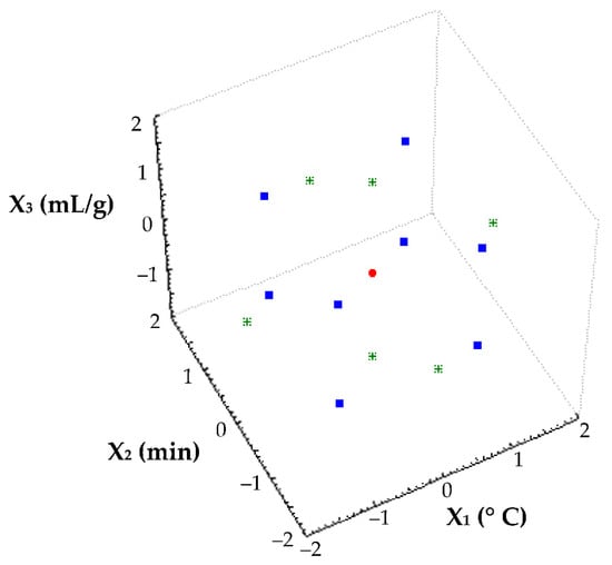 A 3-factor and 2-blocks standard CCD was performed to optimize the effect of the extraction temperature (X1), extraction time (X2), and liquid–solid ratio (X3), on the production of carob syrup in terms of TSS and TPC. Twenty randomized experiments were conducted, consisting of eight cube points, six star points, and six replications at the center values to evaluate the pure error sum of squares and lack of fit test (Figure 1).