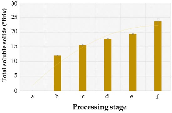 Evolution of TSS (°Brix) after (a) 0 h, (b) 12 h, (c) 24 h, (d) 36 h, (e) 48 h of the carob pods maceration in water, and (f) boiling for 10 min.