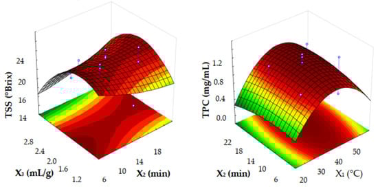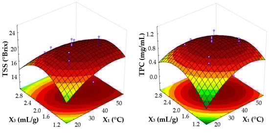 The linear and quadratic terms of X3 was the most significant factor influencing the extraction of both TSS and TPS, as demonstrated by the high values of regression coefficients associated with the linear and quadratic terms (see Equations (1) and (2)). When this factor ranged from 1 to 3 mL/g due to the volume variation, an increment of TSS and TPC were generally observed up to a maximum of around 2 mL/g, as illustrated by the response surfaces, which were generated based on the acquired polynomial equations (Figure 3). It is worth noting that this finding could be interpretable in disagreement with the literature reports, which state how an increase of the solvent–solid ratio generally results in better swelling of plant material, thus enhancing the mass transfer of soluble solids and polyphenols and, consequently, the yield of extraction [13,22]. Instead, as was also noted by Petit and Pinilla [20], the sugar extraction is more efficient as the water–kernel ratio increases, but at the same time, the sugar concentration measured decreases due to dilution.