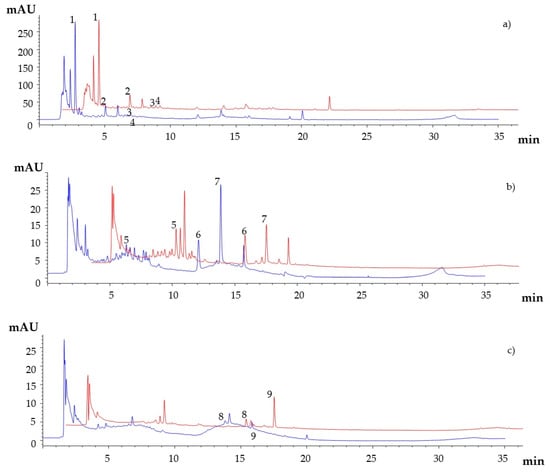 HPLC-DAD chromatograms at (a) 280 nm, (b) 330 nm, (c) 360 nm of traditional (blue line) and UAE (red line) carob syrup diluted 1:3. 1: gallic acid (2.733 min), 2: procyanidin B1 (5.001 min), 3: procyanidin B2 (7.091 min), 4: epicatechin (7.879 min), 5: chlorogenic acid (6.229 min), 6: 4-hydroxycoumaric acid (12.205 min), 7: ferulic acid (13.939 min), 8: myricitrin (13.531 min), 9: quercitrin (15.701 min).