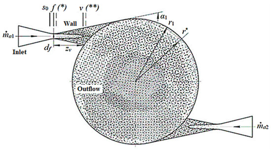 | Critical Cross-Section Diameter, df, mm | Oblique Cut Angle, α, ° | The Taper Angle of the Nozzle, α1, ° | Flow Deflection Angle, δ, ° | Transition through the First Critical Section (*) |