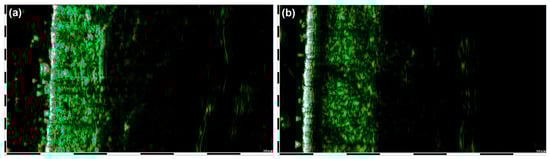 Ultrasound images of sites affected by psoriatic lesions showed a thickened entry echo and streaked shadows perpendicular to the entry echo, probably caused by air bubbles trapped among psoriatic plaques. In addition, the total skin thickness within the psoriatic plaque is increased, and its reduction under the influence of applied therapy can be objectively visualized []. The epidermis is thickened and hyperechoic because the superficial scales produce a hyper-reflective epidermal band [].