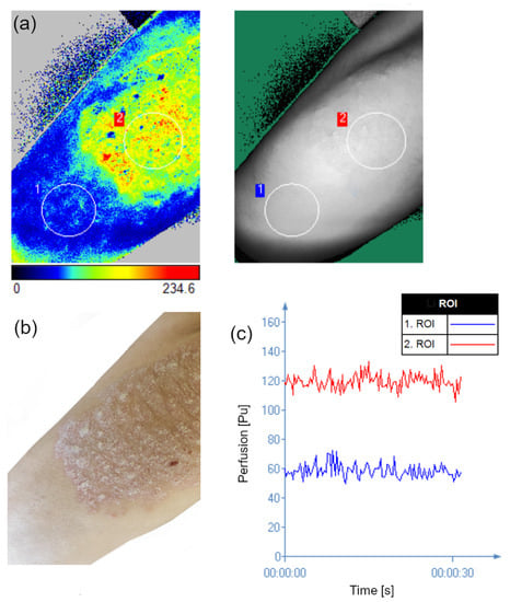 LASCA perfusion map representing the skin without psoriatic lesion (ROI 1) and psoriatic lesion (ROI 2) (a). Clinical photography corresponding to the measured area (b) time evolution of the perfusion in the two ROI shown in image a (c).