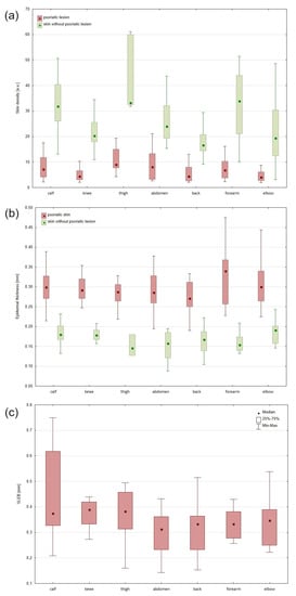 Density of the skin without psoriatic plaques and psoriatic lesion (a). Thickness of the epidermis without psoriatic plaques and psoriatic skin: median, interquartile range, min–max (b). Thickness of the SLEB determined using high-resolution ultrasound: median, interquartile range, min–max (c).