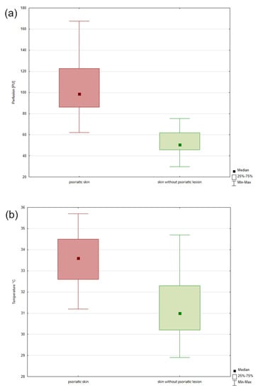 Elevated blood flow in a psoriatic lesion causes an increase in skin temperature in their area. Raman et al. [], using thermal imaging and GLCM feature extraction, showed mean average temperature difference between the normal sort and psoriasis was found to be 2.91 °C on the upper limb region. Zalewska et al. [] evaluated the usefulness of thermography in the estimation of psoriatic lesion activity. Montero-Vilchez et al. [] measured a skin temperature using SkinThermometer (ST 500, Mirocaya, Bilbao, Spain) and compared temperature between healthy skin and psoriatic skin. The thermal imaging camera used in our study provides a more accurate result than the skin temperature measurement with the SkinThermometer and additionally provides information on skin temperature distribution.