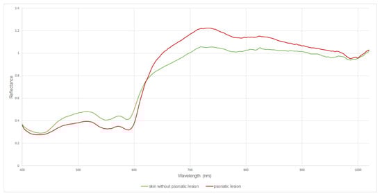 Hyperspectral camera Specim IQ (Spectral Imaging Ltd., Oulu, Finland) were used to compare psoriatic skin and skin without psoriatic plaque. We obtained images with a resolution of 512 × 512 pixels and 204 spectral bands across the wavelength range 400–1000 nm. Spectral image processing was performed using the method developed by Robert Koprowski et al. []; image analysis, conversion of raw data into a matrix and extraction of the selected features in the MATLAB program were carried out. Spectral characteristics were obtained for psoriatic lesion and skin without psoriatic changes (Figure 4).