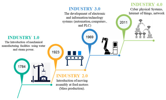 Manufacturing is currently experiencing a paradigm shift in the way that products are designed, produced, and serviced. The industrial revolution refers to the transition in modern history from agrarian and handicraft manufacturing to one dominated by smart manufacturing. The manufacturing industry’s historical development is illustrated in Figure 1. This industrial revolution provided new methods of working and living, drastically altering manufacturing. Such developments and changes have mainly been brought about by the extensive use of the internet and digital technologies. As a result of this transformation, a new industrial revolution known as “Industry 4.0” (I4.0) is emerging, promising mass customization at mass production cost [10]. I4.0 contributes to manufacturing’s digitalization by promoting industrial flexibility and product customization through automation and data sharing in a variety of settings [11]. I4.0 includes a variety of technologies, such as the internet of things (loT), cloud manufacturing (CM), big data (BD) analytics, augmented reality (AR), automation and industrial robotics (AIR), additive manufacturing (AM), modeling and simulation (MS), cyber-physical systems (CPS), cybersecurity (CS), and blockchain (BC) [9,12,13,14,15].