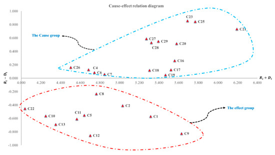 - Create a causal diagram. Within the total relation matrix M, the sum of rows and columns are denoted independently by the vectors and . By mapping the dataset of (,), a cause and effect graph may be obtained. The horizontal axis vector () labeled “Prominence” is created by adding to , indicating the criterion’s relevance. Similarly, the vertical axis () labeled “Relation” is created by subtracting from , which can be used to organize criteria into a cause category. Alternatively, if () is negative, the criterion is assigned to the effect group.