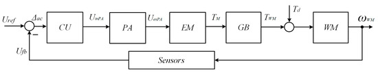 Functional diagram of the electric drive. CU—control unit; PA—power amplifier; EM—electric motor; GB—gear box; WM—working mechanism; Td—load torque; TM—motor torque; TWM—working mechanism torque; Δac—control input error; Uref—reference voltage; UinPA, UexPA—input and output signals of power amplifier; ωWM—shaft speed; Ufb—feedback voltage. (All signals, torques and speeds are presented in relative units, and their basic values correspond to the nominal operating mode of the electric drive.)