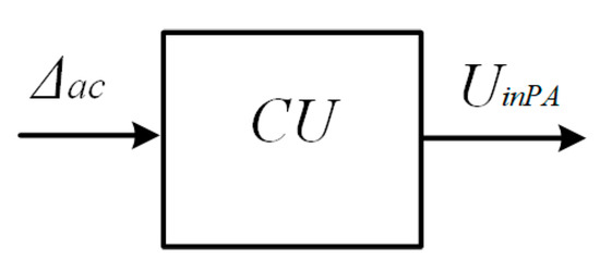 Control unit. Controller CU generating the UinPA control signals for the power amplifier according to the analyzed control error Δac.