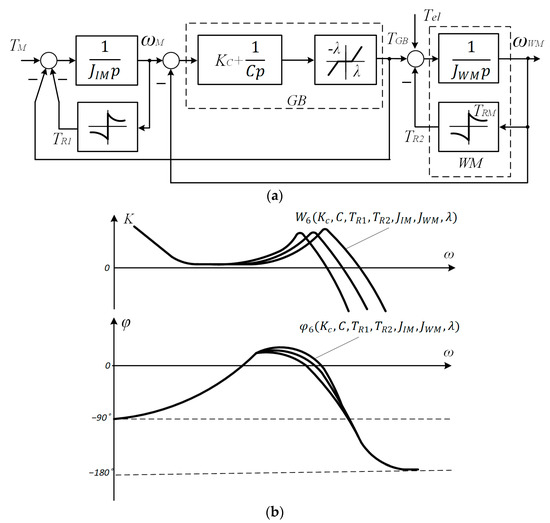 Nonlinear mechanical structure of the electric drive with finite stiffness, backlash and resistance to rotation of the motor and working mechanism (a). Here, WGB-WM – transfer function of the gearbox and working mechanism; JIM, JWM—torques of inertia of the motor and working mechanism; ωM, ωWM—speed of engine and working mechanism; GB—mechanical link (gearbox) with backlash and nonrigidity; Tel—external load torque; TM—motor torque. Frequency characteristic of this electric drive (b).