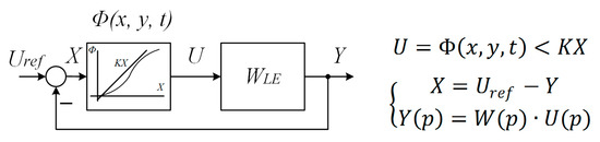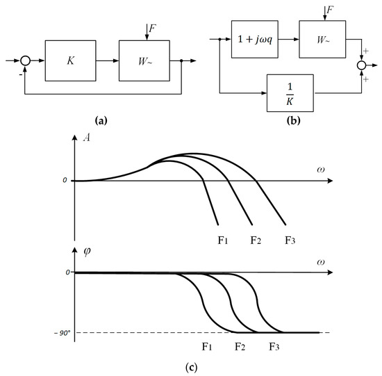 Let us assume that the original nonlinear structure can be transformed into a structure with the circuit shown in Figure 8a. Here, W~ is a nonlinear transfer function, K is a static link limited by the coefficient K, F is an external disturbance that changes is a family of frequency characteristics corresponding to the transfer function W~. In order to reduce the original system to a hyperstable one, it is necessary to replace W~ by in the replacement circuit, which is related to the W~ family by the following condition: for all frequencies ω. Then, the hyperstability conditions can be extended to nonlinear systems of this type: