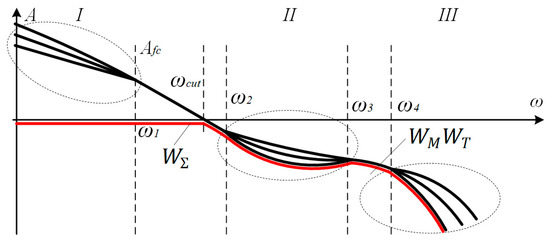 Variations in the region of low frequencies (0–ω1) (I) are caused by the use of various controllers, including nonlinear links W1 or W2.