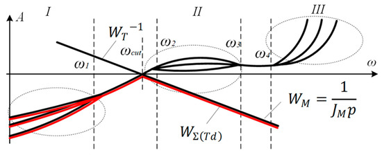 In the region of medium frequencies (ω2–ω3) (II), a significant role is played by nonlinear links in mechanics such as backlash and nonrigidity of the gearbox, as well as the nonlinear laws of the formation of torque in the electric motor (links W4 or W5 and W6).
