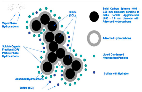 In general, the main components of PM include dry soot, SOF, and sulfate [31]. When the diesel fuel is mixed unevenly in the combustion chamber and there is a local concentration area, it will lead to the local anoxic combustion of the diesel fuel mixture. Dry soot is easily produced when the exhaust temperature is high. Soluble organic fractions account for the majority of PM emitted by diesel and are composed of unburned and fully burned components of a fuel and lubricating oil [32]. When the exhaust temperature is low, it is adsorbed on the surface of various organic fractions and discharged along with the exhaust. These organic components include various unburned organic compounds, oxygenated organic compounds, hydrocarbons, and other derivatives. Sulfates are produced by the presence of sulfur in diesel fuel. Figure 1 shows the specific composition of PM.