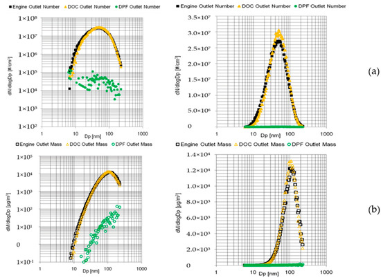 Figure 2. Mass-size distribution of PM (a) and the number of particles (b) under normal engine operation (1750 RPM/3.5 bar BMEP) [34].