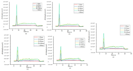 Figure 3. Effects of different amounts of post-injection on PM number size distribution vs. Time: (a) Original; (b) 1 mg; (c) 2 mg; (d) 3 mg; and (e) 4 mg [45].