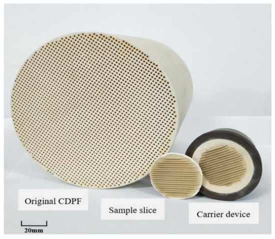 Considering that the thermal stress generated by high temperatures during wall-flow DPF regeneration will affect driving safety and service life [88], a method that can regenerate anytime and anywhere, such as passive regeneration and catalytic diesel particulate filters (CDPF), and the corresponding machine, are proposed [29]. The temperature must be above 550 ℃ during wall-flow DPF regeneration [89], however, the connected exhaust gas cannot reach this temperature, requiring the mixing of catalyst powder into the fuel to make the discharged exhaust gas easier to oxidize [90]. The structure of CDPF is the same as that of wall-flow DPF, but it can prolong the interval time of the DPF active regeneration and service life. The original CDPF, sample slice, and carrier device are shown in Figure 7.
