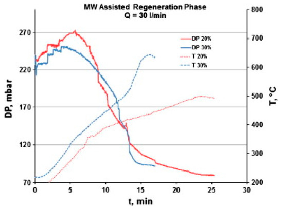 Figure 10. The behavior of the pressure drop through the filter (DP) and temperature profiles during the regeneration phase performed by the microwave generator set at 50% of nominal power and with an exhaust gas flow rate of 30 L/min−1 [123].