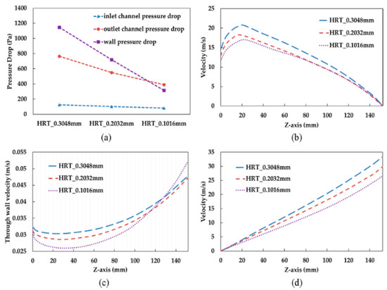 Figure 12. Flow and pressure drop characteristics of HRT with different wall thicknesses under a clean wall condition: (a) Pressure drop composition; (b) Inlet channel velocity; (c) Wall penetration velocity; and (d) Outlet channel velocity [149].