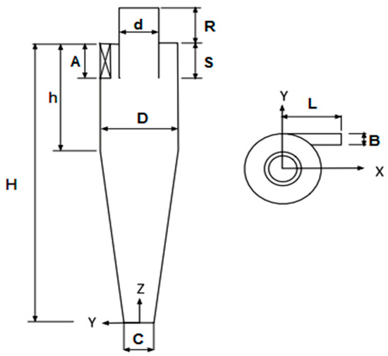 Regarding the importance of the cyclone dimension in the results, the dimensions of the cyclone used in numerical analysis are illustrated in Figure 1. This cyclone is a high separation efficiency Stairmand cyclone with a tangential entrance section. Additionally, the cyclone dimensions are presented in Table 1.