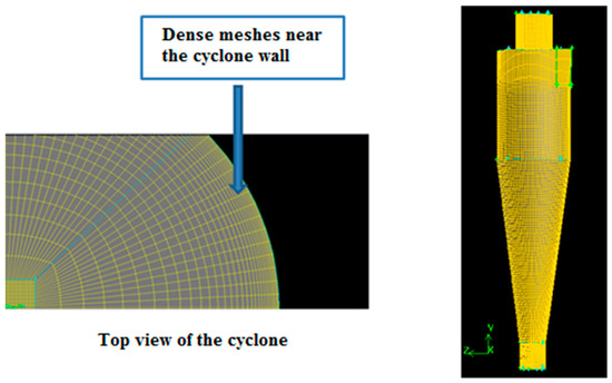 The 3D computational used in the simulations is presented in Figure 3. The grid refinements were employed in the cyclone vortex core and adjacent to the walls to resolve correctly the reverse vortex flow. Four different mesh numbers, (i.e., 425,700, 612,600, 812,410, and 1,146,100) were utilized in the grid independence test. According to the results, the discrepancy among pressure drops was less than 2.5%, when the grid above 612,600 meshes was used. Therefore, regarding the time considerations, the mesh containing 612,600 cells was applied.