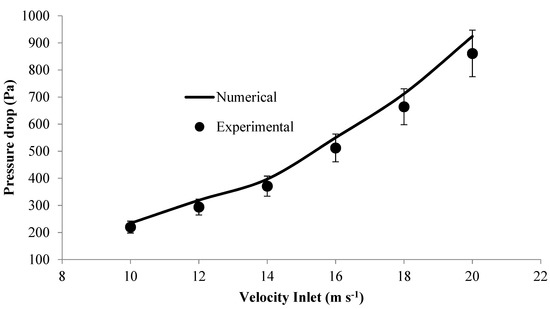 Regarding Figure 10, variations of the Euler number showed an increasing trend up to inlet velocity of 16 m⋅s−1, and a slight increment occurred at velocities of 18 and 20 m⋅s−1 in comparison with 16 m⋅s−1. This behavior can be explained as follows. The inlet dimensions are the same in all simulations; the pressure drop mainly varies with inlet velocity based on vc = 4q/πD2 (Equation (3)), and the Euler number showed the mentioned treatment. In other words, correct computing of the vc plays an essential role in the Euler number. Meanwhile, considering that the relationship between pressure drop and velocity changes is not linear, this parameter can also be effective in decreasing–increasing changes.
