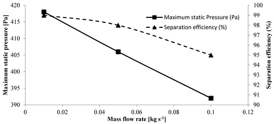 Maximum static pressure and separation efficiency variations in various mass flow rates.