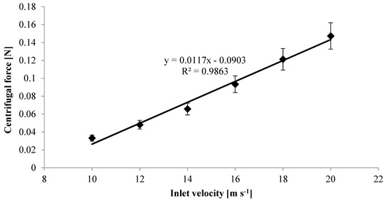 Centrifugal force acting on a particle in various inlet velocities with error bars of 10%.