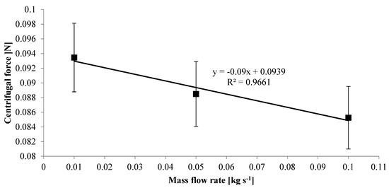 In addition, in various mass flow rates, the centrifugal force decreased with increasing the mass flow rate in values of 0.01, 0.05, and 0.1 kg⋅s−1. It is noteworthy that the main reason for the decrease in the values of centrifugal force is the decrease in tangential velocity regarding increasing the mass flow rate. This reduction trend is shown in Figure 9.