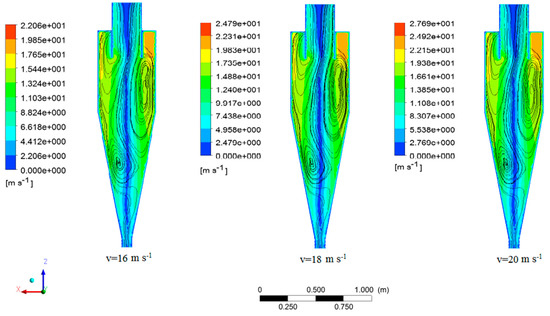 The streamlined contour plots in various inlet velocities are illustrated in Figure 11. For a comprehensive assessment of the streamline inside the cyclone, the streamlines were mounted to tangential velocity contours. The vortex domain was developed by increasing the inlet velocity, especially at inlet velocities of 16, 18, and 20 m⋅s−1. The flow lines represent the flow pattern inside the cyclone.