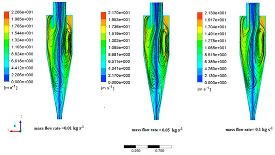 The streamline contours indicated a similar trend for all mass flow rate values. Figure 12 shows the vortexes created inside the cyclone. These vortexes have a beneficial factor in identifying the flow within the cyclone. The streamline was mounted on tangential velocity to obtain a deep understanding of the inside flow. The overall pattern of streamline contour plot mounted on tangential velocity is related to cylindrical dipleg, in which the authors studied the shape of the dipleg on the cyclone performance [33].